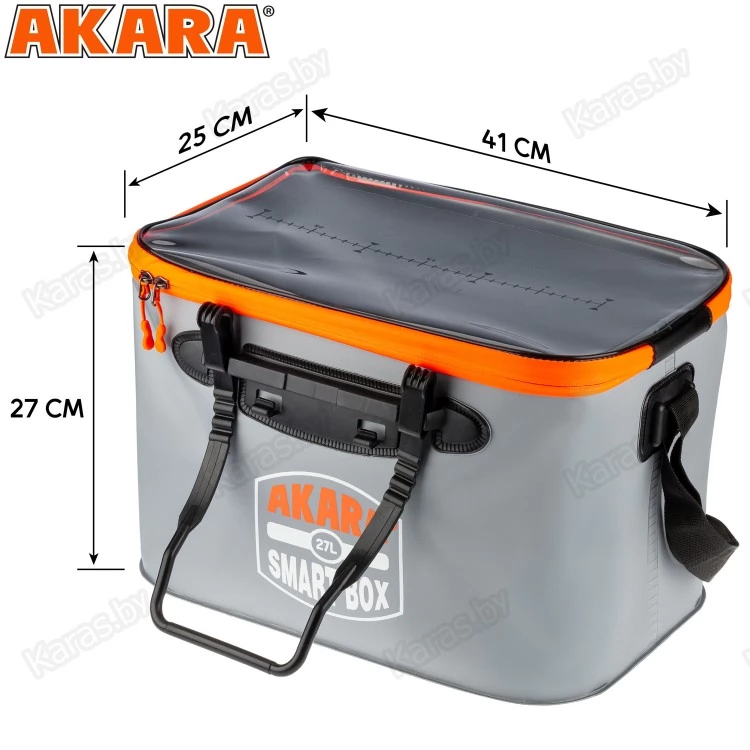 Складная сумка-кан Akara Smart Box изготовлена из прочного ПВХ. Она максимально герметична, благодаря надёжной, плотной молнии. Сумка многофункциональная, её можно использовать для хранения и транспортировки рыбы, замешивания прикормки, переноски воды, грибов, а также хранения рыболовных снастей и принадлежностей. Оснащена двумя прочными ручками для переноски и лямкой для ношения на плече. Верхняя крышка прозрачная. Размер 41х25х27см