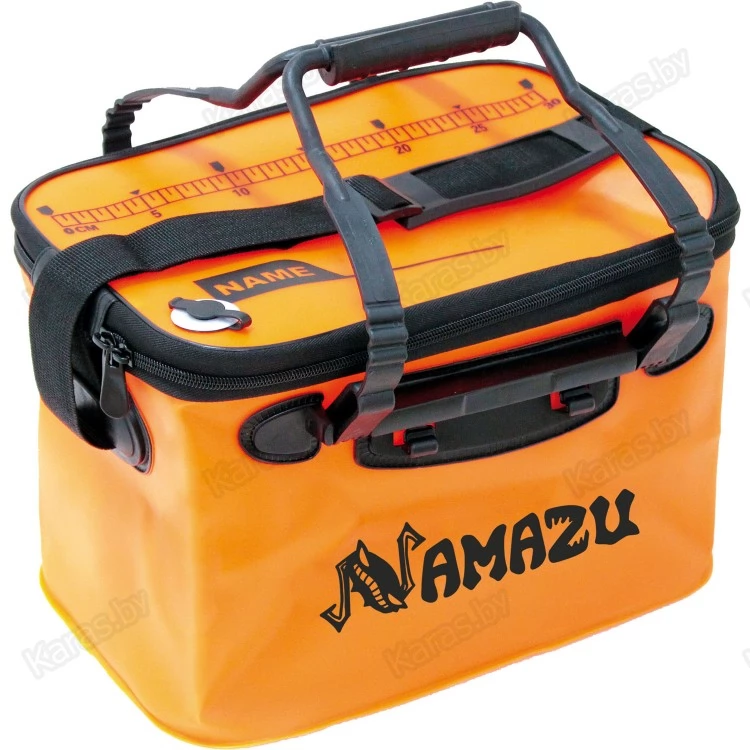 Компактный, легкий, складной кан Namazu  для живца, улова, хранения и переноски снастей. Полностью герметичный, выполнен из ПВХ. Имеется полностью открываемая крышка на надежной молнии. Снабжен двумя ручками для переноски и лямкой для ношения на плече. Дополнительно в крышке есть отверстие для аэратора, линейка.