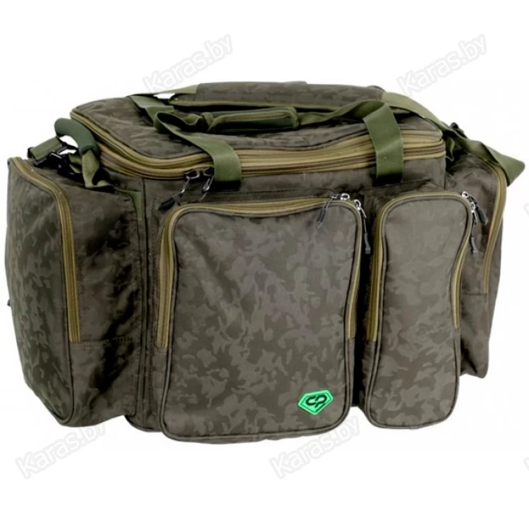 Большая и вместительная карповая сумка со столиком в комплекте. Сумка выполнена из прочного полиэстера и оснащена двумя фронтальными и двумя боковыми карманами на молниях. Замки молний оборудованы прорезиненными пуллерами. Столик имеет тканевое основание с упругим наполнителем. Такое решение позволяет установить стол горизонтально даже на неровной поверхности. Размер столика — 42×31×6 см. Достаточно высокий бортик по периметру стола не позволит скатиться и упасть вещам или рыболовным аксессуарам на землю. Кроме того, столик можно закрепить непосредственно на сумке сверху — для этого предусмотрены две Fastex защелки. Для удобства транспортировки предусмотрены две ручки с неопреновой накладкой и регулируемый наплечный ремень с эргономичной вставкой.