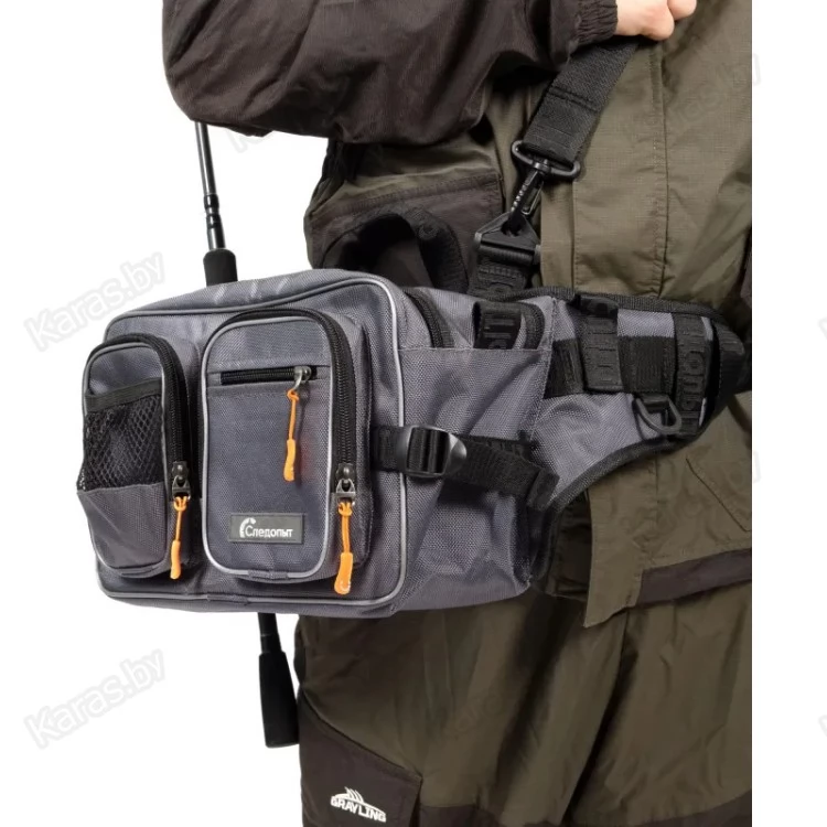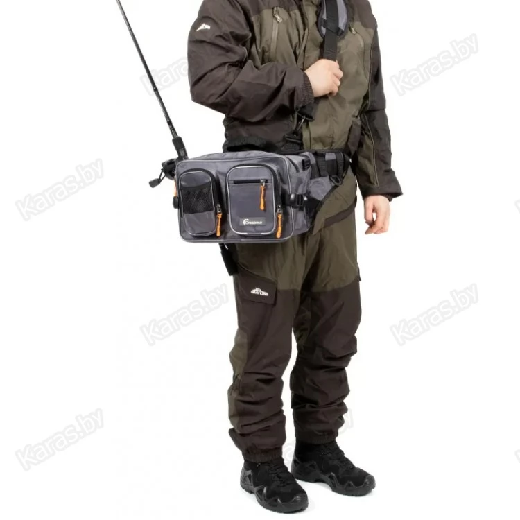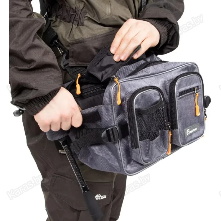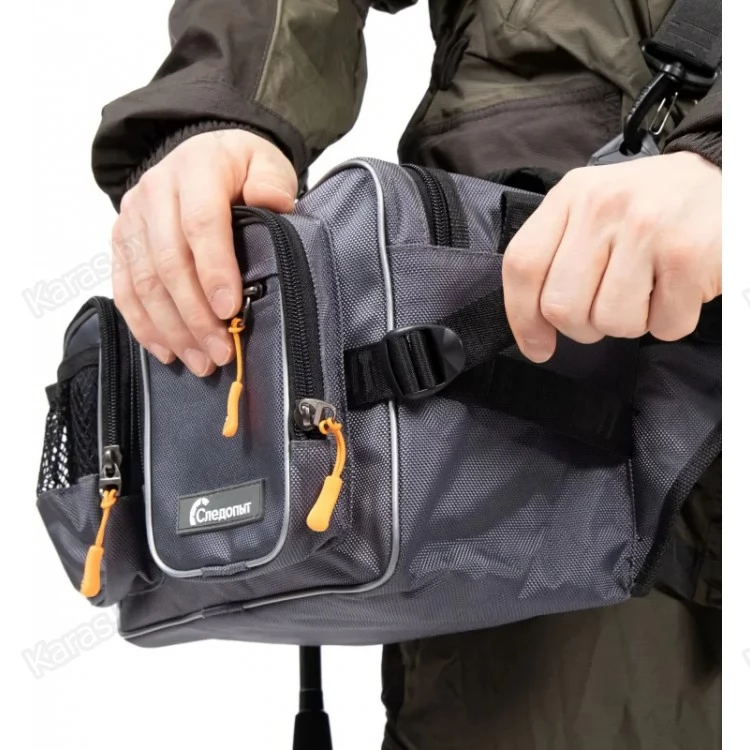 Сумка рыболовная поясная «Следопыт Fishing Hip Bag WBP» имеет одно объемное центральное отделение и два внешних фронтальных кармана. Для крепления ретриверов и различных инструментов предусмотрены D-образные кольца. Сумка изготовлена из плотной и износостойкой ткани 1680D. Конфигурация сумки предназначена как для забродных видов ловли, так и для ловли в стиле «street-fishing». Мультипозиционная сумка предполагает носку на поясе, спине или груди.