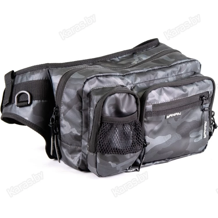 Поясная сумка для рыбалки Yaman Fishing Hip Bag. Основное отделение на двухзамковой молнии габаритами 25х11,5х18,5 см. Фронтальное большое отделение на двухзамковой молнии габаритами 18,5 х 4,5 х 15,5 см. Малое фронтальное отделение на двухзамковой молнии габаритами 8,5 х 4,5 х 16,5 см. Фронтальный сетчатый карман с резинкой. По бокам расположены петли-держатели для инструментов.