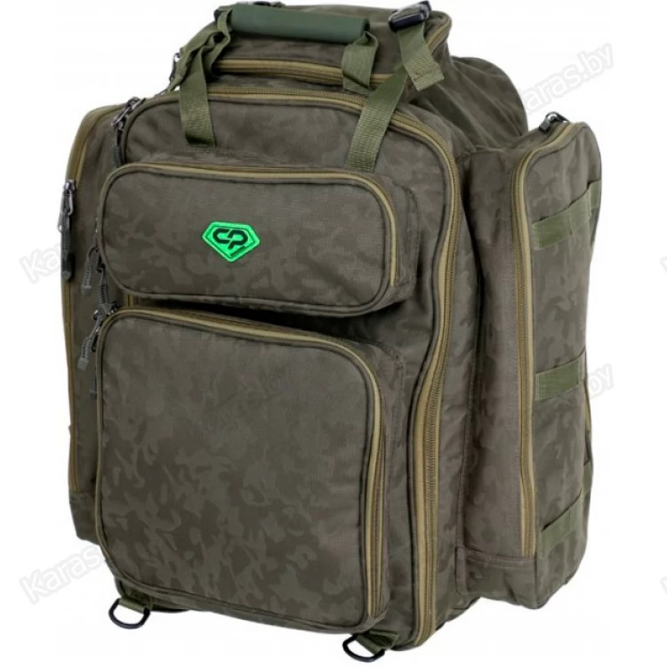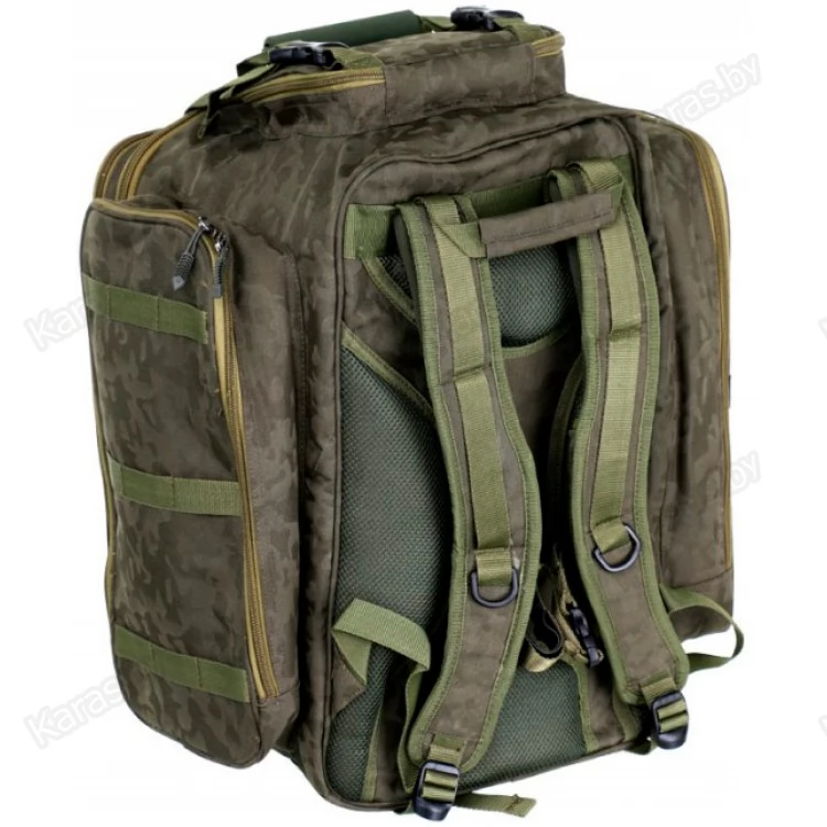 Большая и вместительная карповая сумка-рюкзак. Выполнена из прочного полиэстера и оснащена пятью накладными карманами на молниях — двумя боковыми, двумя фронтальными и одним сверху. Там же сверху расположены два ремня на Fastex защелках, которые позволяют закрепить дождевик, каремат или другое снаряжение. Замки молний оборудованы прорезиненными пуллерами. Транспортировку сумки можно осуществлять при помощи двух ручек с неопреновой накладкой. В случае переноски ее как рюкзака используются широкие наплечные лямки.