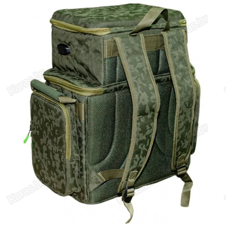 Carp Pro Diamond Ruckback – вместительная сумка-рюкзак для рыболовного снаряжения, вещей и аксессуаров. Изготовлена из фирменного влагостойкого камуфлированного материала Oxford 650D. Оснащена непромокаемым днищем из ПВХ. Большое основное отделение закрывается на двустороннюю молнию, имеет съемную жесткую перегородку на липучках и способно вместить все необходимое как для коротких рыболовных сессий, так и для длительных выездов. Сверху на клапане Diamond Ruckback расположен бокс со съемными перегородками на 3 отделения, предназначенный для всевозможных мелочей, электронных гаджетов и прочего снаряжения. Бокс имеет встроенный шнур для Power Bank с внешним разъемом USB для подзарядки мобильных телефонов и прочих устройств. В закрытом состоянии может использоваться как монтажный столик. Кроме того рюкзак оборудован вместительным фронтальным карманом и двумя боковыми на молниях, где удобно разместятся небольшие коробочки с терминальными снастями и аксессуарами. Для небольших пакетиков и инструментов предусмотрен плоский накладной кармашек на молнии, а для карабинов и ретриверов – прочные петли. Мягкая вентилируемая спинка, ручки для переноски с накладками из EVA и две регулируемые широкие лямки обеспечивают максимальное удобство при транспортировке CarpPro Diamond Ruckback.
