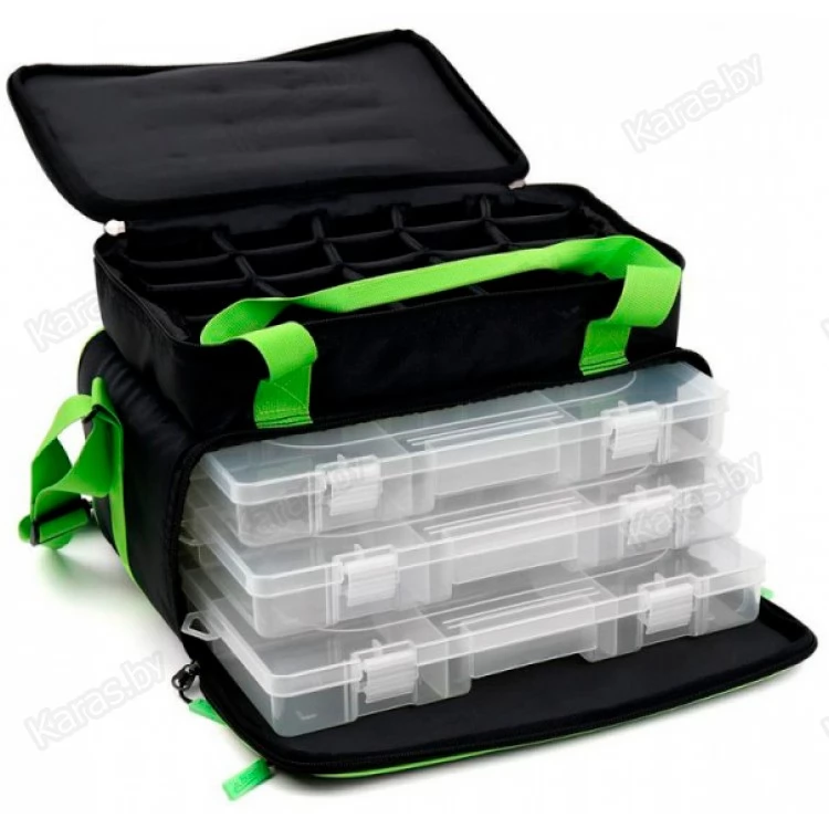 Практичный дизайн и высокое качество сумки с тремя большими прозрачными пластиковыми коробками (36х23х5см) делают ее универсальной и незаменимой. Коробки располагаются в нижней части и имеют по 15 отделений, а в верхней части сумки большое пространство, которое предназначено для хранения кормушек и прочих аксессуаров небольшого размера. Верхнее и нижнее отделения закрываются клапанами на "молнии". На клапане с коробками расположен один сетчатый карман. Сумка имеет прочные ручки, а также толстый мягкий ремень для переноски на плече.