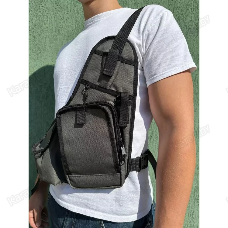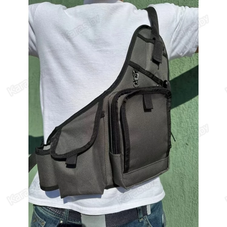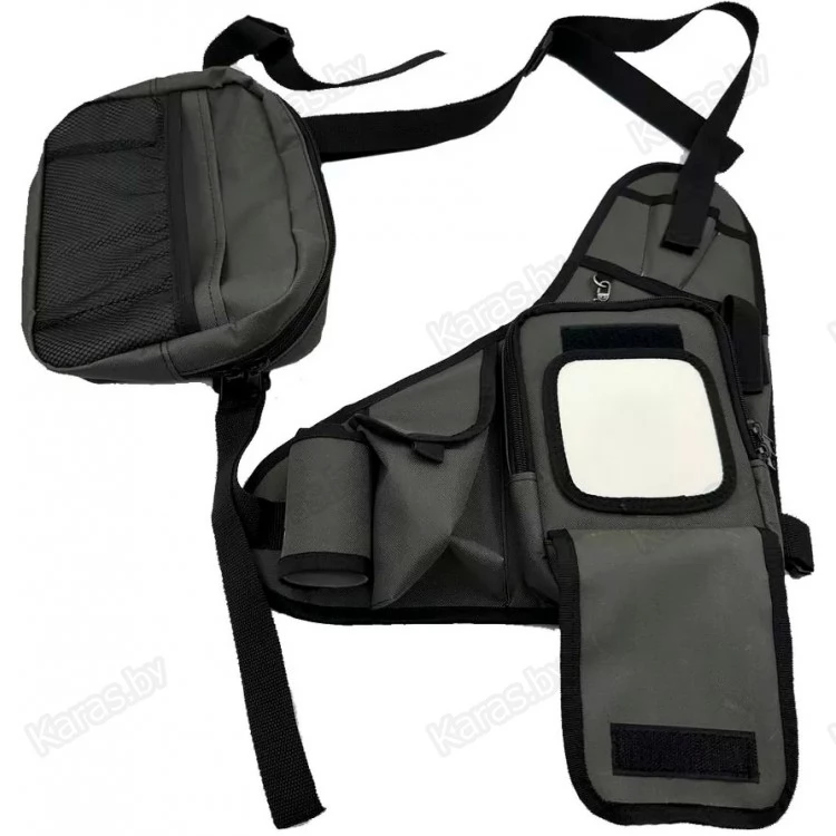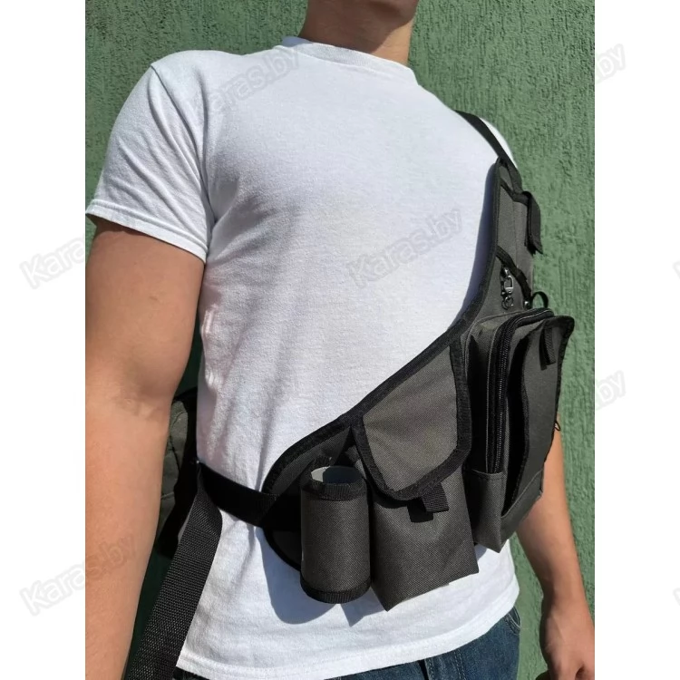 Удобная рыболовная спиннинговая разгрузка с 3-мя основными карманами. Плечевая рыболовная сумка спиннингиста выполнена в виде разгрузки. Это практичный и удобный в использовании аксессуар, в котором поместится рабочий набор приманок и необходимые для эффективной рыбалки инструменты. Рабочее пространство можно сформировать двумя пластиковыми коробками в соответствии с собственными предпочтениями и поставленными задачами. При ловле на ультралайтовую снасть стационарные отсеки легко и быстро разбиваются съемными разделителями на небольшие ячейки. При загрязнении ткань легко очищается влажной салфеткой. Систем представляет собой два блока, соединенных стропой. В одном из них находятся держатель удилища, карман на липучке и сумка с органайзером, на передней панели которой размещена вставка с пенкой, прикрытая клапаном. На подложке удобно держать приманки, которые используются наиболее часто. Клапан застегивается на липучку, что обеспечивает быстрый доступ к приманкам. На металлических петлях можно закрепить инструменты, которые должны находиться под рукой.