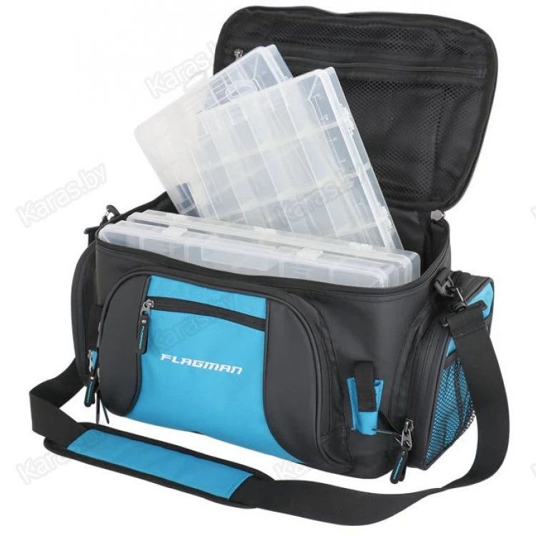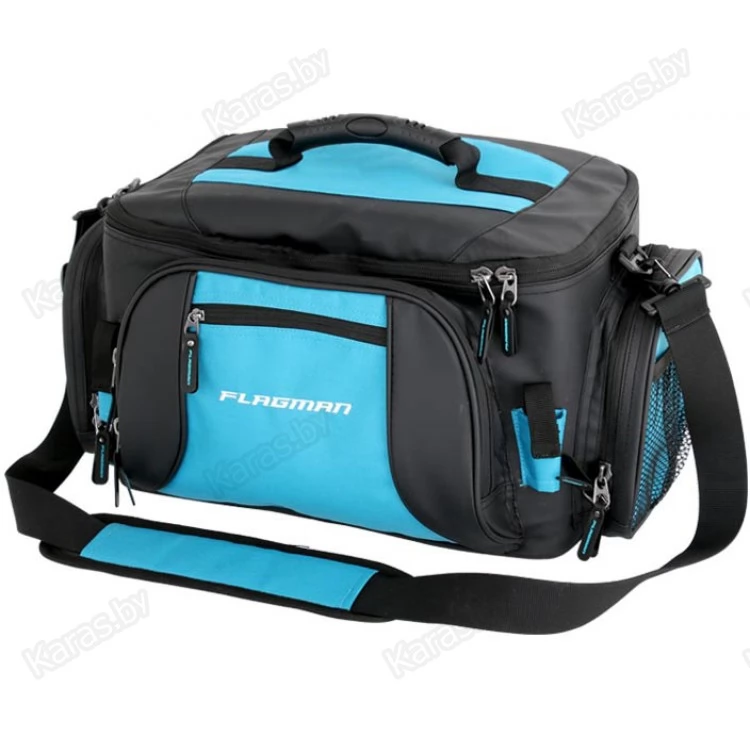Достаточно большая и вместительная спиннинговая сумка на молнии с набором коробок. Сумка выполнена из прочной синтетической ткани. Оснащена двумя боковыми карманами, наплечным ремнем с эргономичной накладкой и усиленной ручкой. В комплект входят четыре коробки из прозрачного пластика с ячейками для мелких рыболовных аксессуаров и принадлежностей.