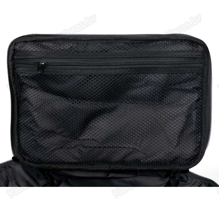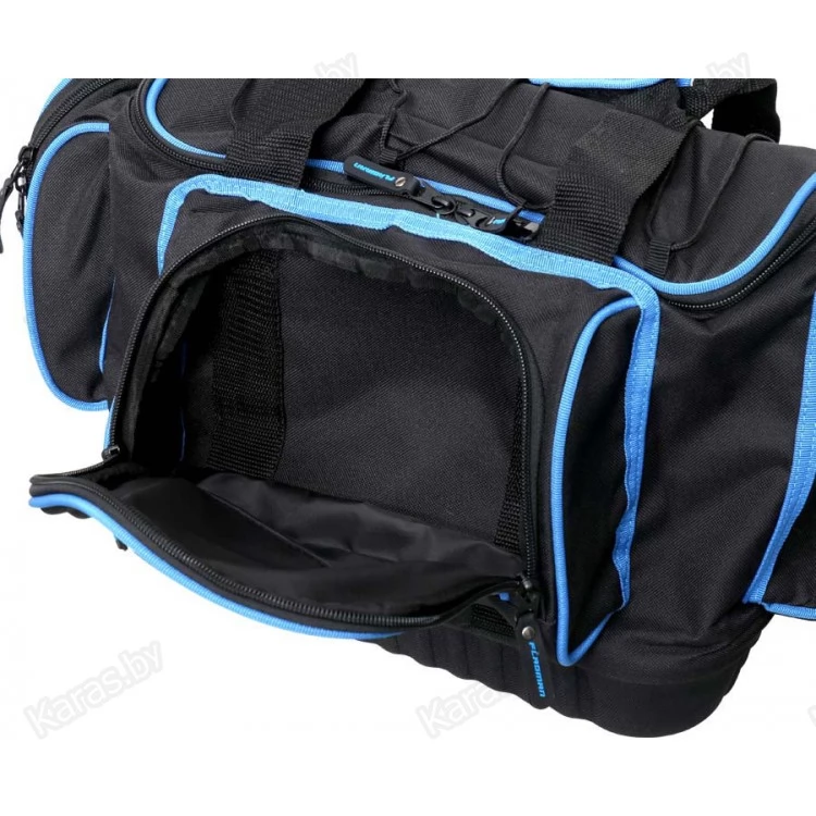 Достаточно большая и вместительная спиннинговая сумка на молнии для транспортировки и хранения одежды, рыболовных принадлежностей и коробок с приманками. Сумка выполнена из прочной синтетической ткани. Непромокаемое жесткое дно сформовано из плотного прорезиненного материала. Сумка оснащена двумя боковыми карманами и одним фронтальным. Сверху крышки предусмотрена шнуровка для закрепления плащ-накидки или других предметов экипировки, с внутренней стороны всю площадь занимает большой сеточный карман на молнии. Для транспортировки сумки используются наплечный ремень с мягкой накладкой и ручки.