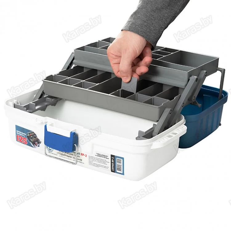 Ящик ЯР-2 выполнен из высококачественного полипропилена, который удароустойчив, влагонепроницаем и устойчив к изменению температур, при этом материал не вступает в химическую реакцию с силиконовыми приманками, твистерами, что делает его незаменимым помощником в любом виде рыбалки. Вертикальная нагрузка на ящик в 125 кг позволяет использовать его в качестве сидения на рыбалке, не боясь за его целостность. Ручка ящика надежная, со специальными фиксаторами с двух сторон, которые исключают возможность прогиба ручки, при полной загрузке ящика снастями. Ящик закрывается на прочную защелку с металлической скобой, которая полностью исключает возможность самопроизвольного открытия, а металлические оси обеспечивают надежность крепления и долговечность использования данной модели ящика. При открытии крышка ящика служит опорой, 2 лотка выдвигаются вертикально с помощью крепких рычагов: Лотки оснащены съемными перегородками, с помощью которых можно создавать ячейки нужных размеров под определенные снасти. На верхний лоток можно укладывать крупные снасти: воблеры, блесны, катушки с леской. На среднем лотке можно уместить мелкие и средние снасти. Нижний лоток достаточно глубокий: в него можно поместить личные вещи либо инструмент, эхолот, фонарик, катушки с запасными шпулями. Ящик эргономичен, удобен для переноски, компактные размеры позволяют его использовать и в ходовой, и в лодочной ловле, в домашних условиях он подходит для хранения и комплектации инструментов, запчастей.