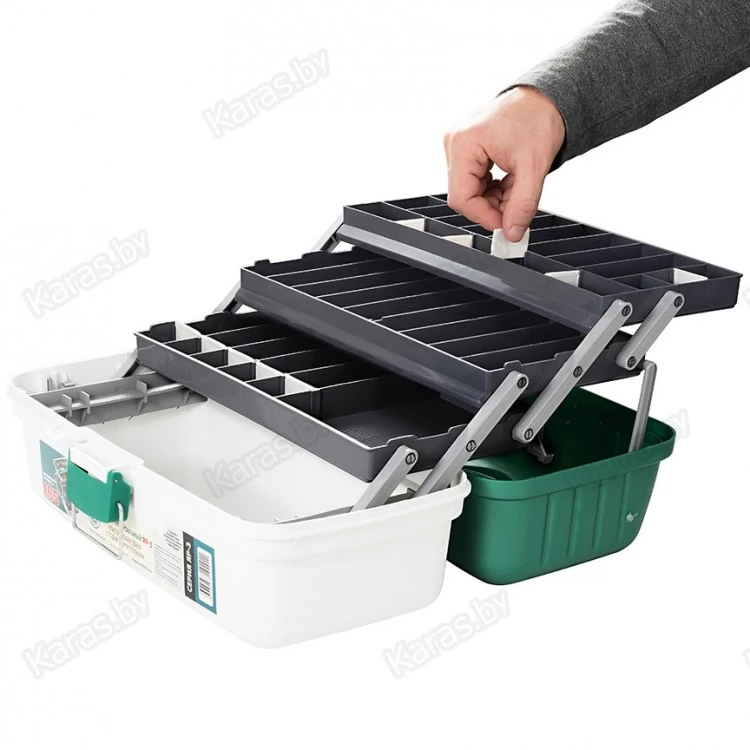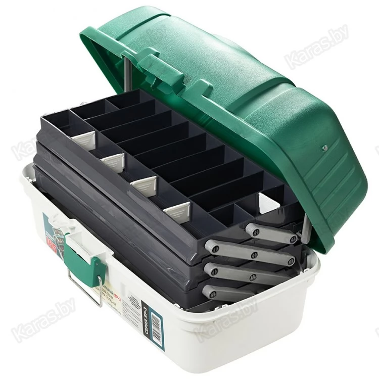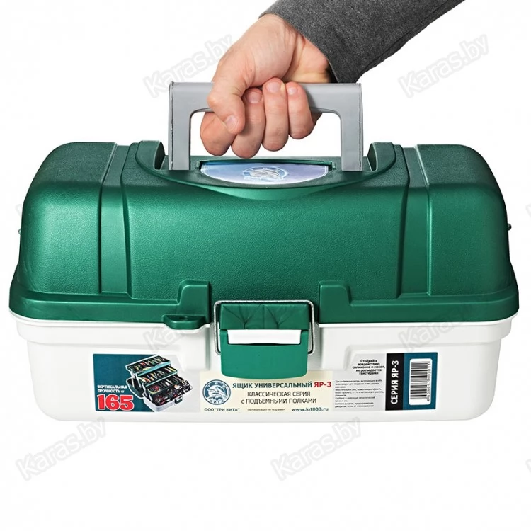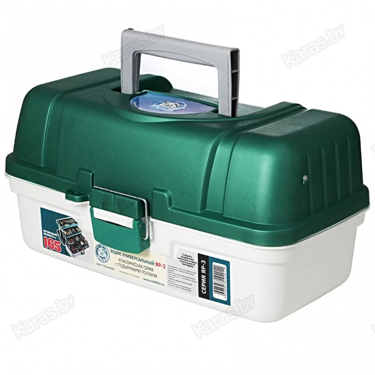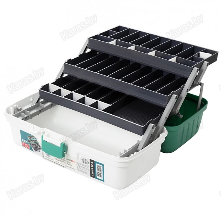Ящик выполнен из высококачественного пластика-полипропилена, который обладает качествами ударостойкости и не вступает в химическую реакцию с силиконовыми приманками, водонепроницаем, хорошо выдерживает перепады температур. Полупрозрачная, матовая крышка позволяет быстро выбрать приманки, которые располагаются в верхнем лотке ящика. Вес ящика, его эргономичность делают его незаменимым помощником и в ходовой, и в лодочной ловле. Ящик надежно закрывается на прочную защелку с металлической скобой, что обеспечивает невозможность самопроизвольного открытия. Петли и крепления на металлической оси, надежные. При открытии ящика шарнирной системой, автоматически выдвигаются 3 лотка для приманок, что позволяет сразу оценить все содержимое ящика. К ним в комплекте идут съемные разграничители ячеек, с помощью которых можно устанавливать размеры ячеек под себя и использовать полный арсенал приманок, блесен, крупных и мелких воблеров. Основная ниша ящика может вместить как спиннинговые катушки, катушки лески, нож, экстрактор, приманки, оснастки, поводки, готовые монтажи, комплектовать отдел под личные нужды. При закрытии ящика лотки закрываются плотно, все снасти находятся изолированно друг от друга, благодаря чему полностью исключаются моменты спутывания и перемешивания приманок. Ящик имеет удобную, прочную ручку, которая в закрытом положении находится в крышке ящика и не выходит за его пределы. Ящик ЯР-3 – необходим для любого типа рыбной ловли, он вместителен, но при этом не занимает много места ни в машине, ни в лодке, а его вертикальная прочность, составляющая 165 кг, позволяет использовать ящик в качестве сиденья на рыбалке при необходимости. Ящик ЯР-3 прекрасно подходит и для бытового использования в целях хранения, сортировки инструментов, запчастей или иных нужд.