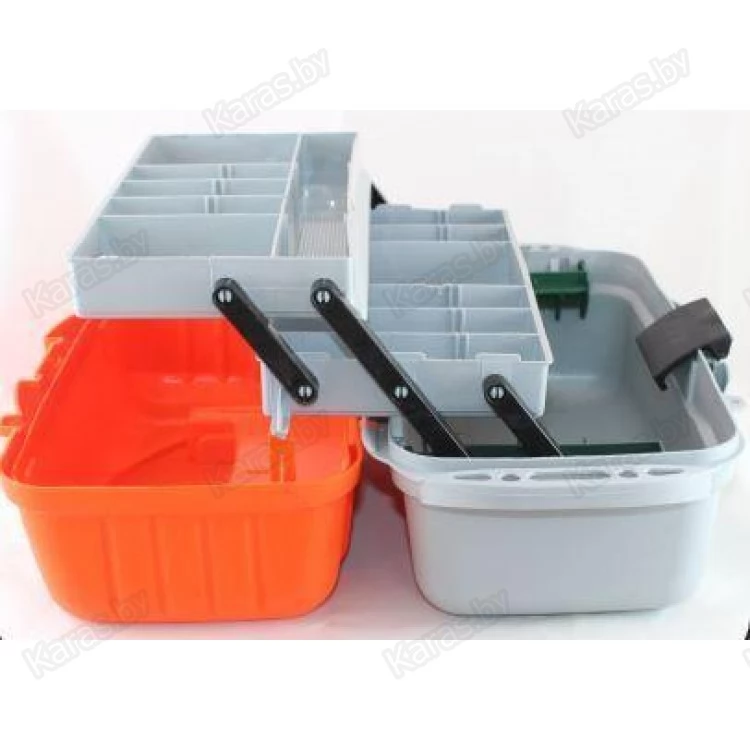 Удобный и вместительный ящик с тремя выдвижными полками для различной рыболовной оснастки: поплавков, приманок, крючков и другой полезной мелочи.