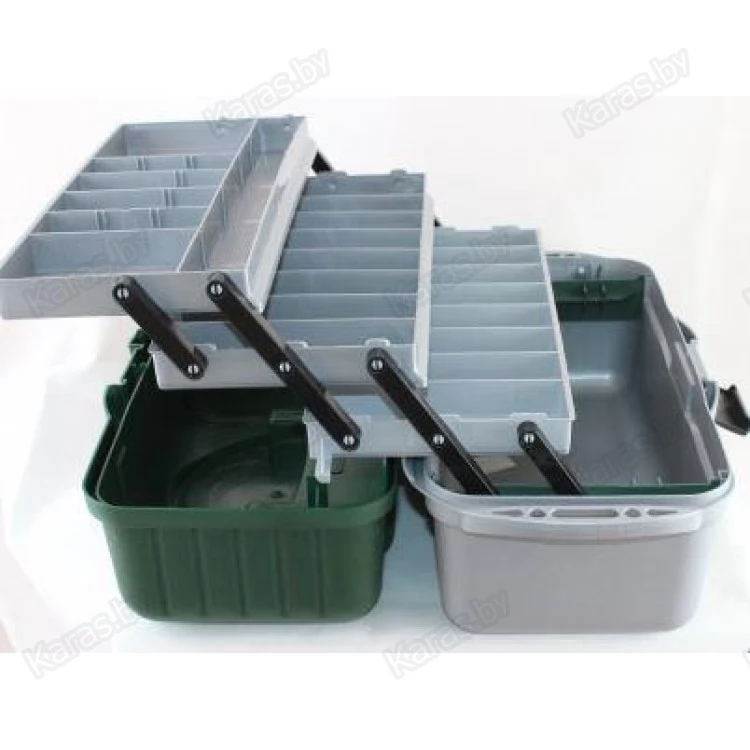 Удобный и вместительный ящик с тремя выдвижными полками для различной рыболовной оснастки: поплавков, приманок, крючков и другой полезной мелочи. Количество секций варьируется от 24 до 34. На дно ящика можно положить 1-3 спиннинговых катушек.