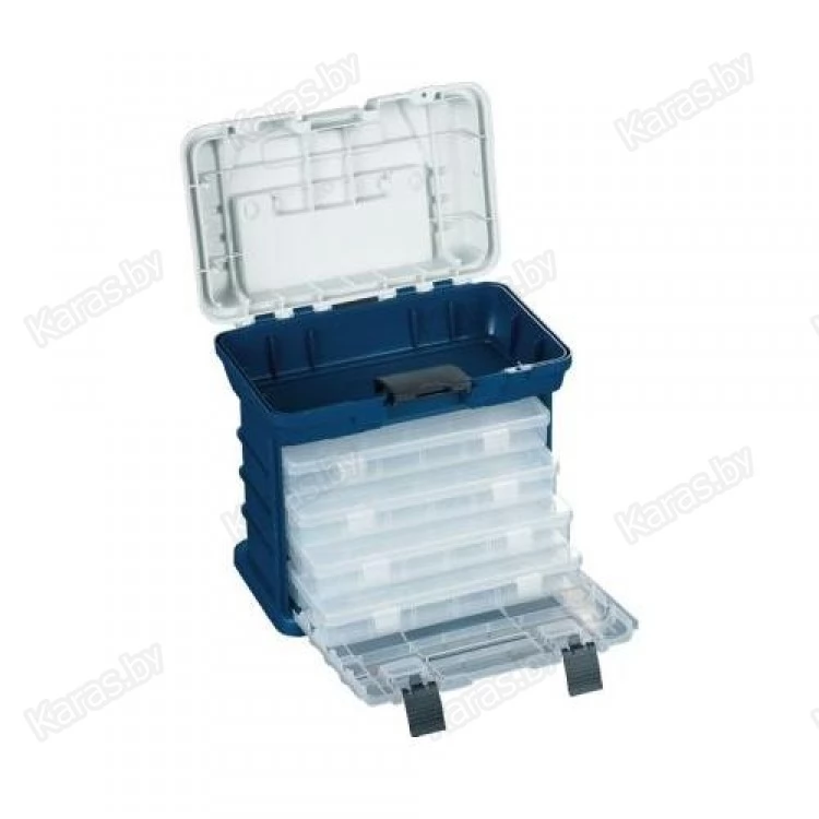 Компактная система хранения "все в одном". Пластиковый бокс состоит из большого верхнего отсека, в котором помещается катушка или объемные приманки (размер отделения 24х12х7.5 см.). В основном отсеке находятся 4 односторонние коробочки с переставляемыми перегородками. Все отсеки имеют надежные и удобные замки. Бокс очень удобен в переноске и использовании в лодке.