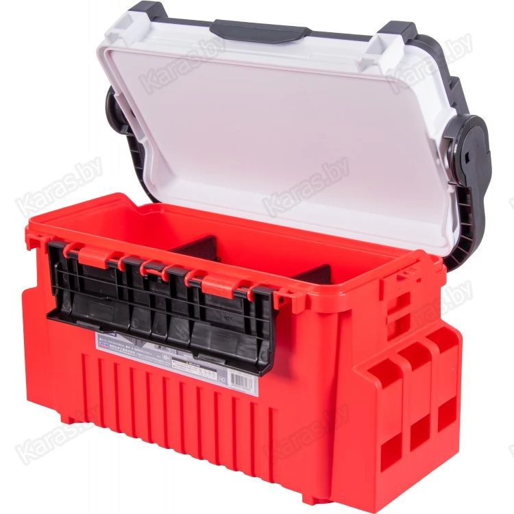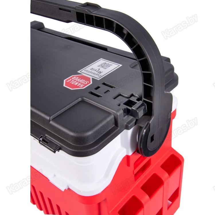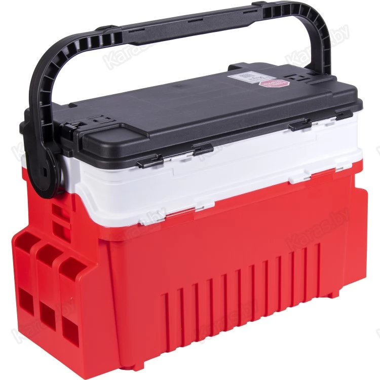 Основной фишкой ящика является ручка особой конструкции, на которую возложено сразу три функции. Она служит для переноски и фиксации крышки в закрытом положении. Помимо этого, ручка обеспечивает опору для откинутой крышки, превращая ее в удобный столик. А если Вы приобретете дополнительный обвес и стаканы-держатели для удилищ, то откроете дополнительные возможности этого детища японских экспертов. В комплект входят противоскользящие накладки на ножки.