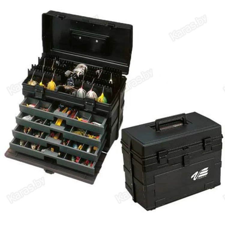 Если Вы полагаете, что можно найти такой же ящик у других, то ошибаетесь. Эта «хрустальная мечта спиннингиста» сделана из первичного пластика, а не вторсырья, что обеспечивает и долговечность, и прочность и длительное сохранение формы. Кроме того, ящик имеет специальные укрепляющие детали как вдоль, так и поперек периметра основного короба. Защелки не только надежны конструктивно, но и имеют металлические штифты. Четыре выдвижных полки с отсеками различного размера и глубокое верхнее отделение со множеством стоек для блесен, воблеров, спиннербейтов и т.д. Удобная ручка в опущенном виде полностью «утапливается» в крышке, поэтому при хранении и транспортировке ящик не имеет каких-либо выступающих деталей, которые могут создать проблемы.
