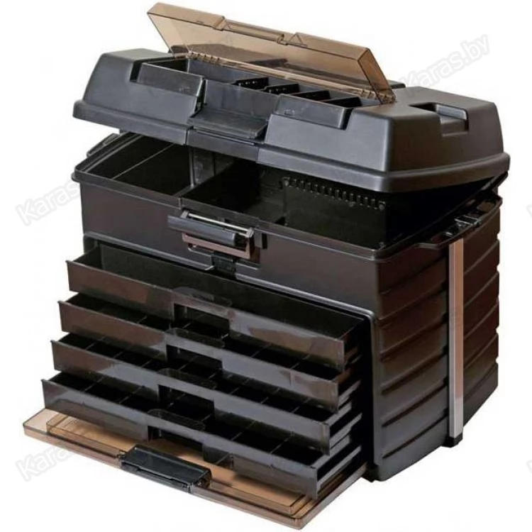 - В верхней части крышки ящика расположено дополнительное отделение с открывающейся прозрачной крышкой для хранения рыболовных принадлежностей и небольших коробок, оснащенное съемными перегородками для разграничения пространства;