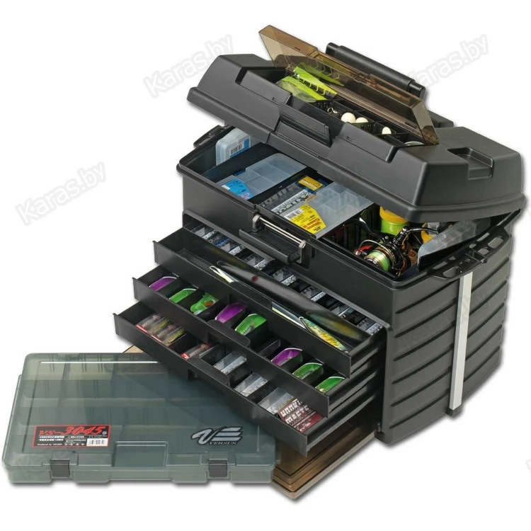 Основное отделение необычайно просторно и позволит вам распределить в нем все необходимые вещи на рыбалке, начиная от деталей оснастки и заканчивая габаритными катушками. Вы сможете сами распорядиться, как использовать это обширное внутреннее пространство, в чем вам помогут множество съемных перегородок. Подобно тому, как ребенок экспериментирует и складывает конструктор Lego, так и вы сможете комбинировать разными коробками, наполняя основной отсек. Для его наполнения прекрасно подойдут такие коробки как: VS4060, VS820NDM, VS820ND, VS502, VS702, VS802, FLY-S, LURE-S, WORM-S и многие другие. Все зависит от вашей фантазии и предпочитаемого вида ловли.