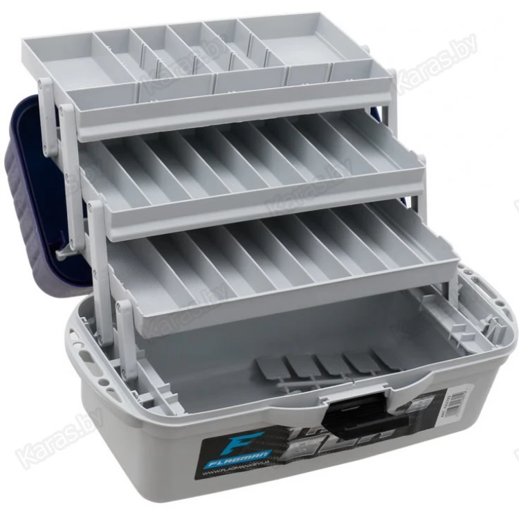Трёхполочный ящик для рыболовных снастей. Изготовлен из полипропилена, устойчив к воздействию масел, растворителей и силиконов. Блок из двух полочек имеет раскладную конструкцию. В транспортном положении полочки плотно прилегают друг к другу, не давая содержимому рассыпаться. Верхняя поверхность имеет 10 съемных перегородок, которые делят каждый отсек еще на несколько. Система фиксированных и съемных перегородок позволяет формировать внутренние пространство по своему усмотрению. Основное отделение ящика не имеет перегородок и предназначено для хранения крупных предметов. Оснащен плотной крышкой, которая крепиться с помощью шарнирного соединения, закрывается на замок-защелку. Подходит для транспортировки и хранения любых приманок. Обладает вертикальной прочностью не менее 90 кг.