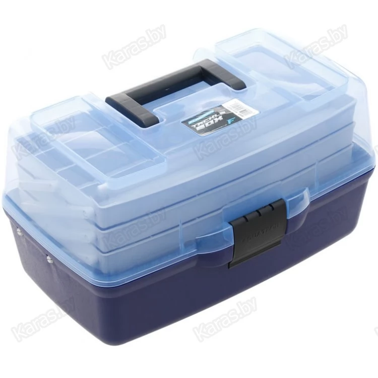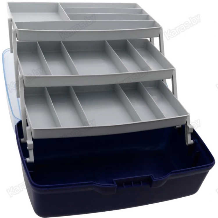 Трёхполочный ящик для рыболовных снастей. Изготовлен из полипропилена, устойчив к воздействию масел, растворителей и силиконов. Блок из трёх полочек имеет раскладную конструкцию. В транспортном положении полочки плотно прилегают друг к другу, не давая содержимому рассыпаться. Система фиксированных и съёмных перегородок позволяет формировать внутренние пространство по своему усмотрению. Основное отделение ящика не имеет перегородок и предназначено для хранения крупных предметов. Оснащен прозрачной крышкой, которая крепиться с помощью шарнирного соединения, закрывается на замок-защелку. Подходит для транспортировки и хранения любых приманок.