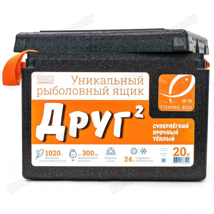 Самый компактный вариант из серии ящиков-поплавков «Друг», которые разработаны с учетом всех требований к комфорту на рыбалке. Ящик сделан из легкого и прочного пенополипропилена и при небольшом собственном весе выдерживает нагрузку до 300 кг. В нем можно переносит снасти, приманку, личные вещи и улов. Ящик можно использовать как сиденье и небольшой столик. Он легко моется изнутри, не крошится и не рассыпается под воздействием ветра и солнечных лучей. Высокие теплосберегающие свойства позволяют использовать «Друг» как изотермический контейнер. Летом он не даст замороженным продуктам разморозиться и испортиться, а зимой – наоборот замерзнуть содержимому.