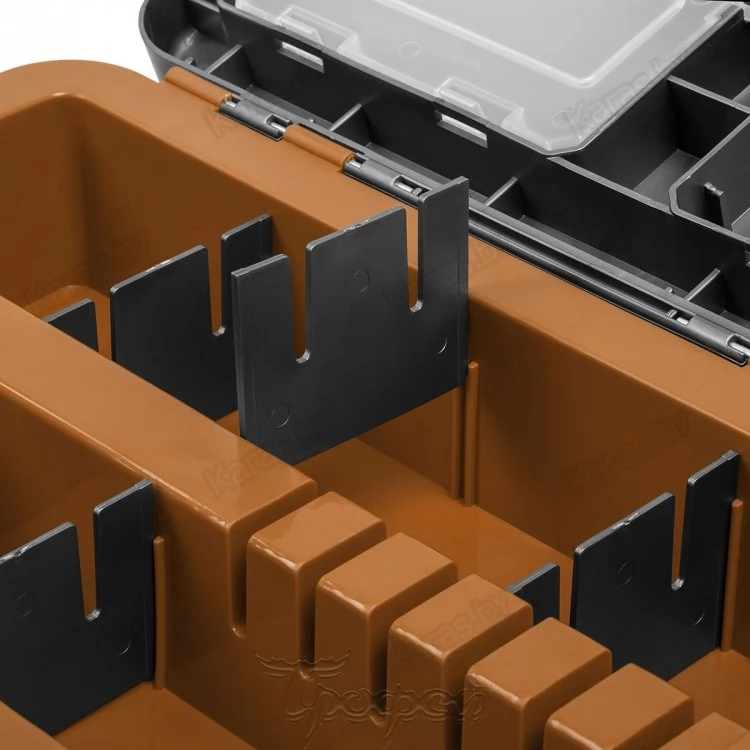 Основной отсек предназначен для переноски рыболовных снастей, термоса, так же удобен для перевозки улова. На внутренней стороне крышки размещены 4 отделения с полупрозрачными крышечками для хранения мелких аксессуаров.