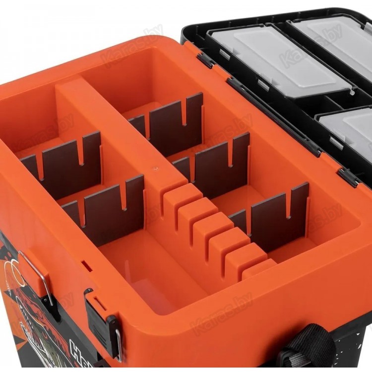 Основной отсек предназначен для переноски рыболовных снастей, термоса, так же удобен для перевозки улова. На внутренней стороне крышки размещены 4 отделения с полупрозразчными крышечками для хранения мелких аксессуаров. Удобные и надежные замки гарантируют плотное прилегание крышки к основному отсеку ящика.