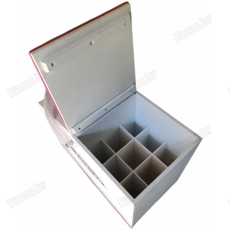 — Ящик состоит из двух отделений. Первое отделение имеет 9 секций для удочек, в которые могут помещаться до 36-ти удочек одновременно. При необходимости, этот отсек демонтируется из ящика;