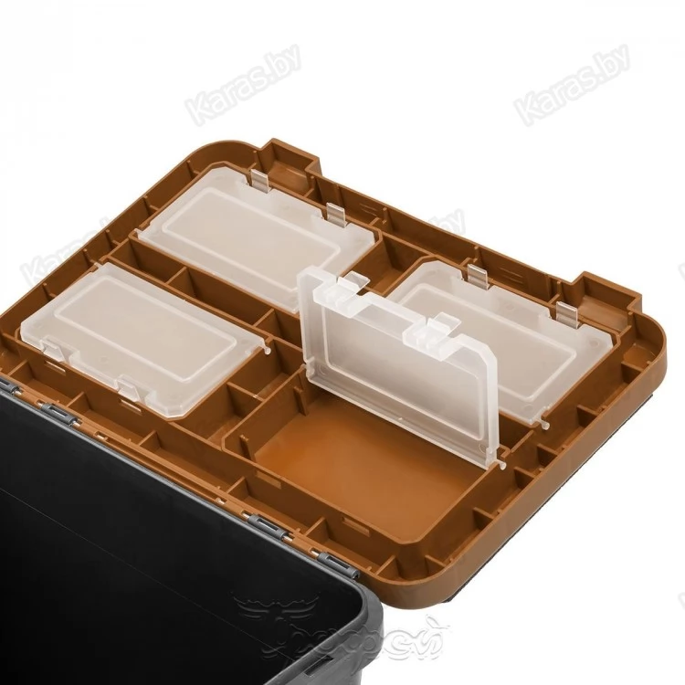 Основной отсек предназначен для переноски рыболовных снастей, термоса, так же удобен для перевозки улова. На внутренней стороне крышки размещены 4 отделения с полупрозрачными крышечками для хранения мелких аксессуаров.