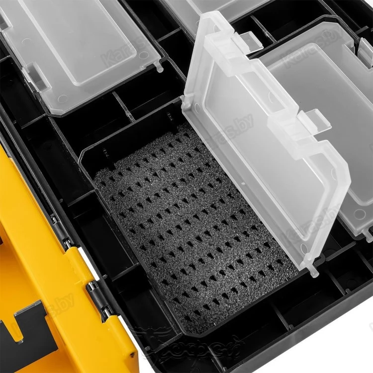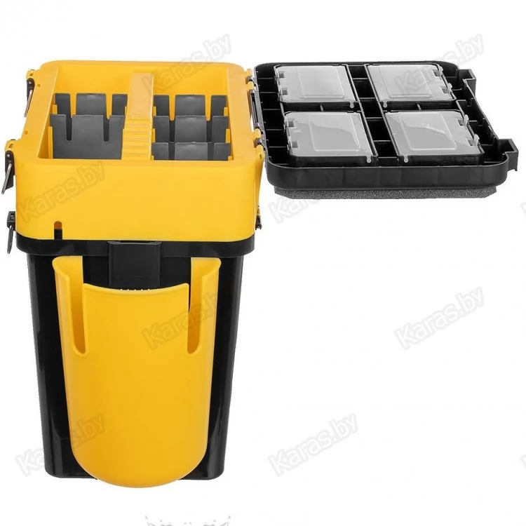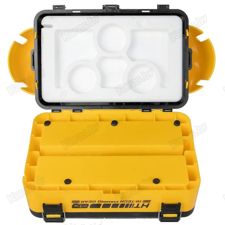 На внутренней стороне откидной крышки размещены 4 прозрачных закрывающихся бокса, в которых достаточно места для блесен, балансиров, рыболовных крючков, мормышек и прочих мелких снастей. В одном из боксов размещена подложка с прорезями для хранения мормышек.