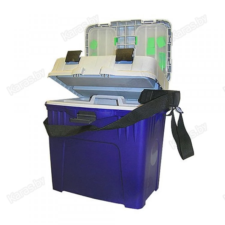 Большое нижнее отделение имеет две съемные перегородки и вынимаемый поддон для хранения удочек. Второй ярус ящика состоит из двух отделений для мелочей со съемными перегородками. Объемная крышка сверху имеет мягкое синтетическое покрытие, к ней, с внутренней стороны, крепятся на замках две коробки для приманок. Также ящик для рыбалки комплектуется широким регулируемым наплечным ремнем. Стоек к воздействию мороза, силиконов, масел и большинства растворителей. Модель выдерживает вертикальную нагрузку до 130 кг. Универсальный ящик-сиденье.Описание: 2-ух ярусный. Вес, кг: 3.3.