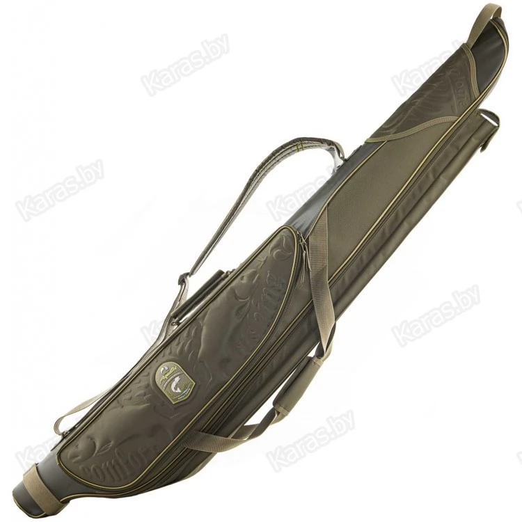Снаружи расположен длинный карман для подсака или стоек и объемный карман на молнии для аксессуаров. В чехол помещается до 5 удилищ с катушками. Внутренняя часть выполнена из мягкого ворсистого материала на который крепятся специальные подушки для катушек.