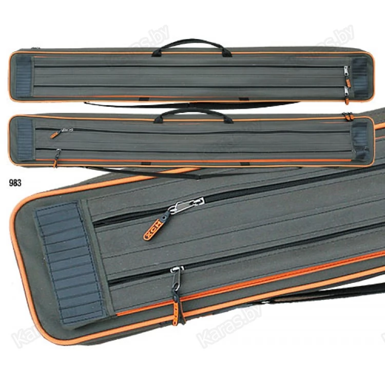 Имеются наружные карманы для стоек и дополнительных аксессуаров. Чехол имеет внутреннюю съемную защитную перегородку, а на боковых стенках предусмотрено крепление дополнительных чехлов под катушку. В комплекте имеются два мягких чехла для катушек. Для переноса чехла имеются ручки и плечевой ремешок с вшитой лямкой.