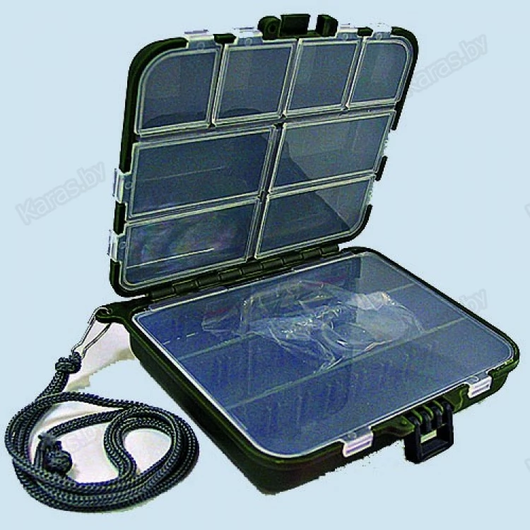 Двухстворчатая коробочка для крючков с отделениями в каждой ее части. Каждое отделение створки имеет защитную прозрачную крышку. Коробочка имеет ремешок для переноски.