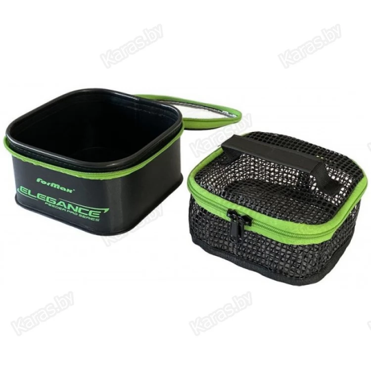 Контейнер из материала EVA с прозрачной крышкой на молнии и еще один сетчатый контейнер (мешочек) внутри - также с застежкой-молнией, предназначенный для хранения, но при необходимости и для смачивания пеллетса.
