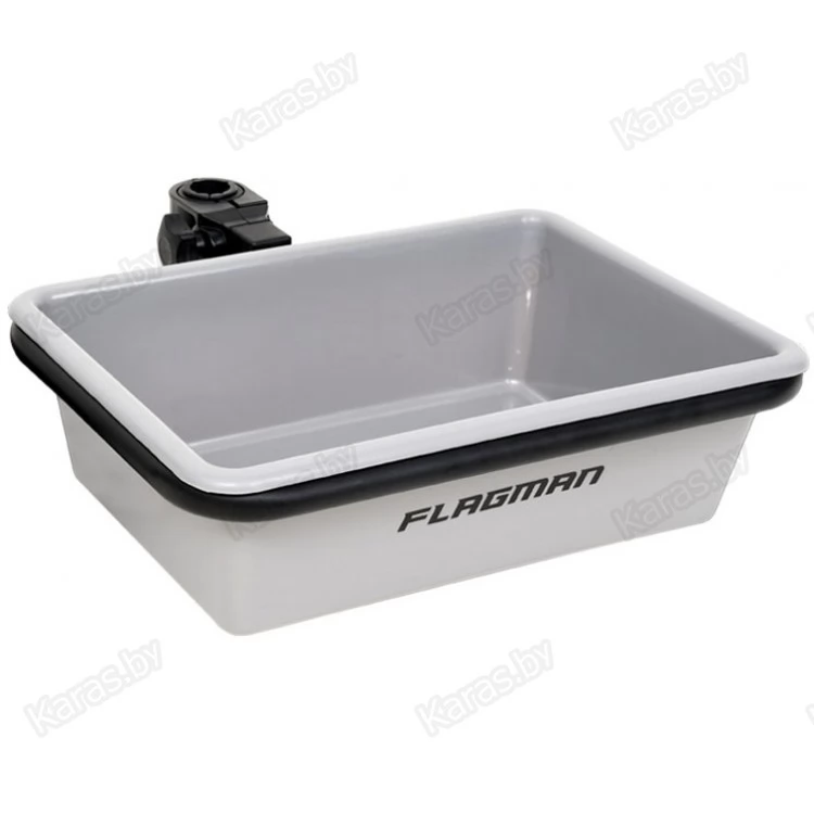 Прямоугольная пластиковая емкость, предназначенная для хранения небольшой порции прикормки в процессе ловли. Оборудована металлическим ободом с креплением, которое, благодаря специальным вставкам (входят в комплект), может фиксироваться на ноги платформы диаметром 25 и 30 мм.