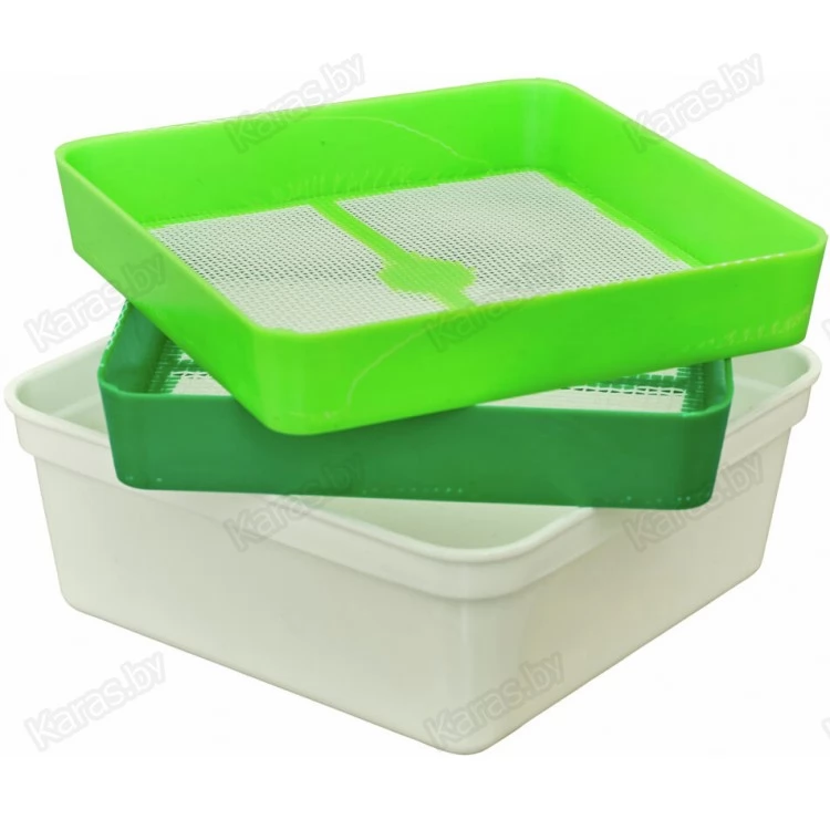 Набор из двух сит и одной коробки размера L, предназначенный для просеивания мотыля или опарыша. Размер емкости 165x165x75мм.