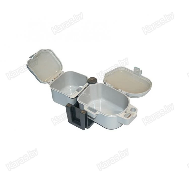 Коробочка для хранения живой наживки с двумя отделениями и с легко съемным креплением к ремню рыболова.