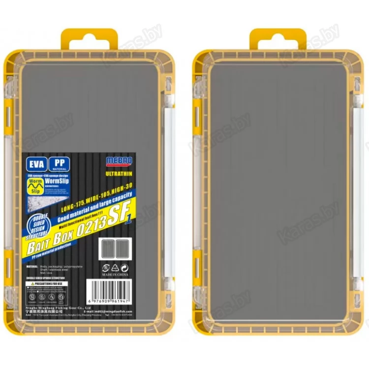 Коробка двухсторонняя Mebao 0223SF1 от компании Mebao – тонкая коробка. Отлично подойдет под хранение различных ультралайтовых приманок или миниатюрных джиг-головок. Отлично сочетается с форелевыми ящиками и без проблем помещается в верхней отсек под крышкой. Коробка сделана из прочного надежного пластика, пригодного для хранения силиконовых приманок. Крышка коробки выполнена из полупрозрачного пластика, что помогает сразу определить содержимое.