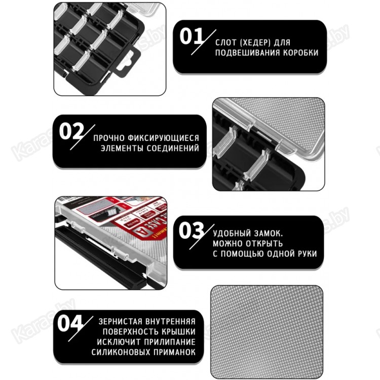 Представляем вашему вниманию удобную и функциональную коробку органайзер, созданную специально для рыболовов, ценящих порядок и эффективность. Она идеально подходит для хранения блесен, мормышек, джиг-головок и других мелких приманок, позволяя быстро находить нужное снаряжение в любых условиях. Коробка имеет компактные размеры 175 × 105 × 18 мм и легко помещается в карман или рыболовную сумку. Вес около 100 граммов делает её практически незаметной в экипировке. Изготовлена из прочного износостойкого пластика, устойчива к механическим повреждениям и воздействию влаги. Внутренние отсеки позволяют удобно распределить приманки по типам, что предотвращает путаницу и ускоряет их замену во время рыбалки. Крышка плотно закрывается, надёжно фиксируя содержимое и защищая его от выпадения даже при активной транспортировке.