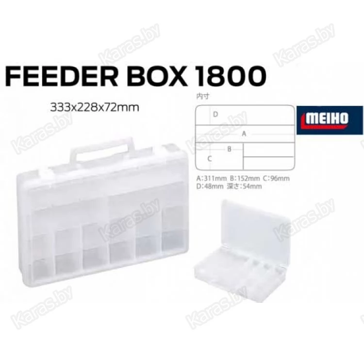 MEIHO Versus Feeder Box 1800 — коробка для рыболовных приманок и аксессуаров большого размера. Наличие удобной рукоятки для переноски позволяет использовать ее в качестве самостоятельного чемоданчика. Вместе с тем коробка может использоваться и в качестве комплектного элемента рыболовной сумки, в которую можно поместить 3-4 подобные коробки.