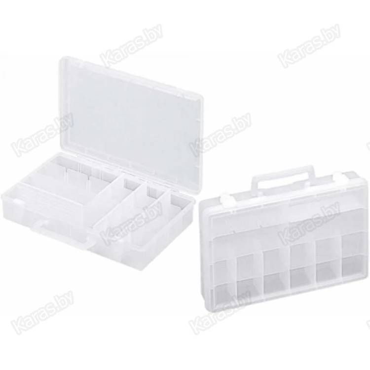 Рыболовная коробка Feeder Box #1800 имеет 5 отделений различной конфигурации: два длинных, два коротких и одно большое, занимающее четверть отсека. Комплектуется съемными перегородками, благодаря которым внутреннее пространство можно разделить на 16 ячеек, подстраивая их размеры под собственные нужды. Такая конструкция позволяет рационально использовать рыболовную коробку, удобно размещая различные расходные элементы, комплектующие и аксессуары для самых разных видов ловли.