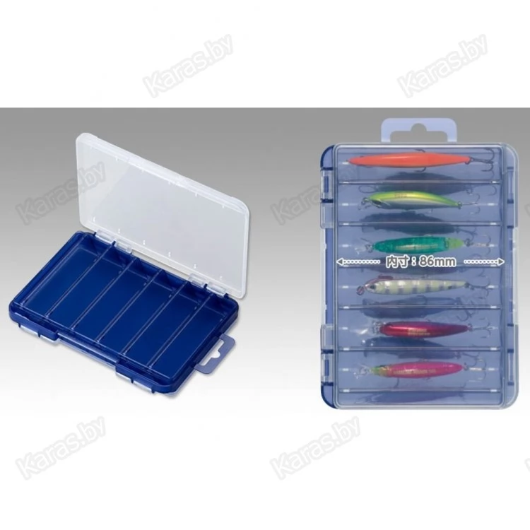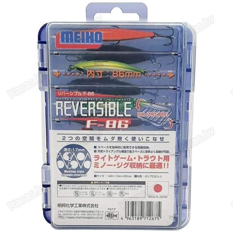 Meiho Reversible F-86 — новинка в семействе двухсторонних рыболовных коробок. Позволяет наиболее эффективно использовать внутреннее пространство, а также исключает контакты приманок и их крючков между собой, предохраняя тем самым лакокрасочное покрытие воблеров и других приманок. С обеих сторон коробки имеется по шесть ячеек треугольной формы длиной 86 мм. Коробки подходят для хранения: