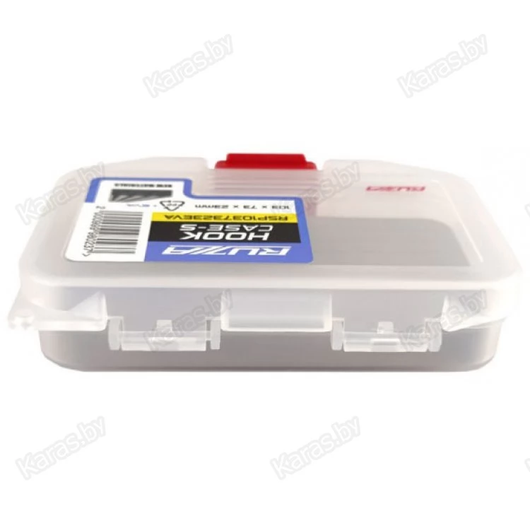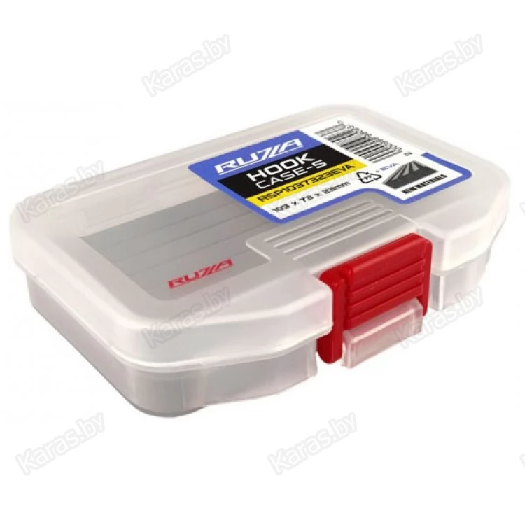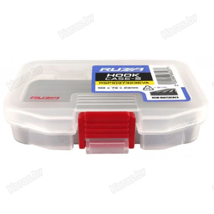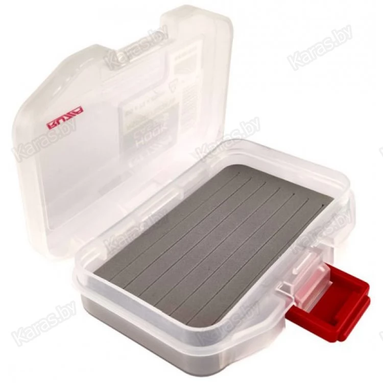 Односторонняя коробка из ударопрочного армированного пластика PP (полипропилен). Отсек снабжен плотной вспененной подложкой из EVA (этиленвинилацетат) с прорезями для надёжного хранения крючков и некрупных приманок.