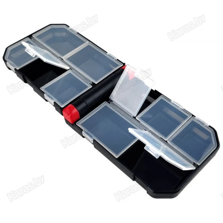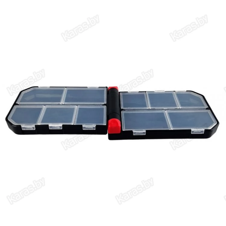 Компактная двустороняя коробка из ударопрочного армированного пластика PP (полипропилен) для всевозможной рыболовной мелочевки. В крышке и корпусе по пять самостоятельных отделений, симетрично расположенных. Идеальный вариант для хранения колечек, застежек, вертлюгов, крючков.