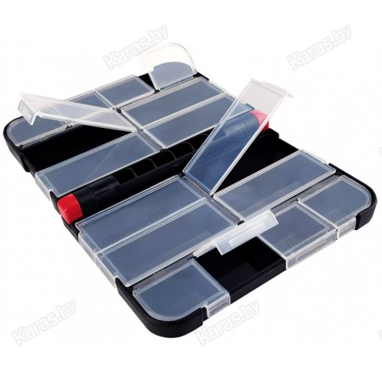 Компактная двустороняя коробка из ударопрочного армированного пластика PP (полипропилен) для всевозможной рыболовной мелочевки. В крышке и корпусе по пять самостоятельных отделений, симетрично расположенных. Идеальный вариант для хранения колечек, застежек, вертлюгов, крючков.