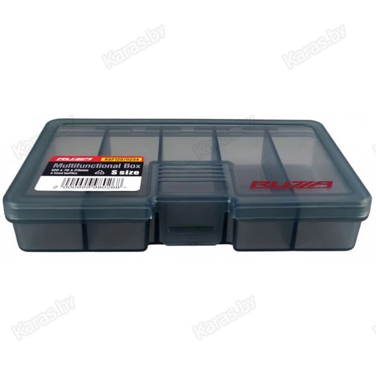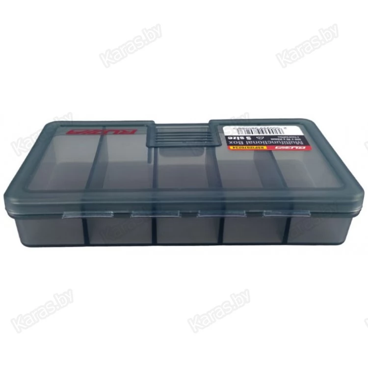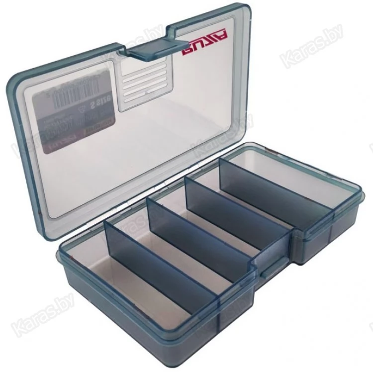Односторонняя коробка для хранения приманок и аксессуаров из ударопрочного армированного пластика PP (полипропилен). Коробка имеет четыре фиксированные перегородки, делящие ее на 5 самостоятельных отсеков.