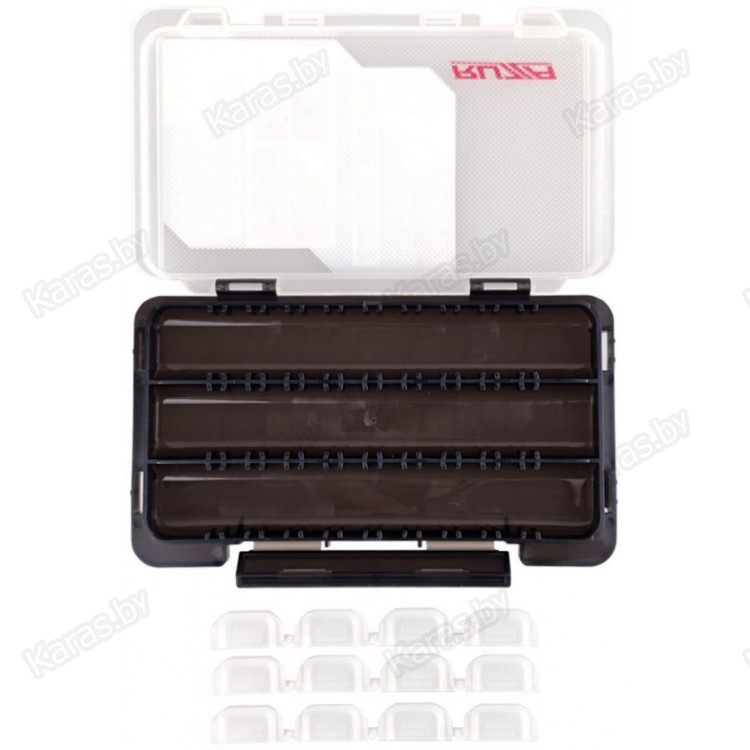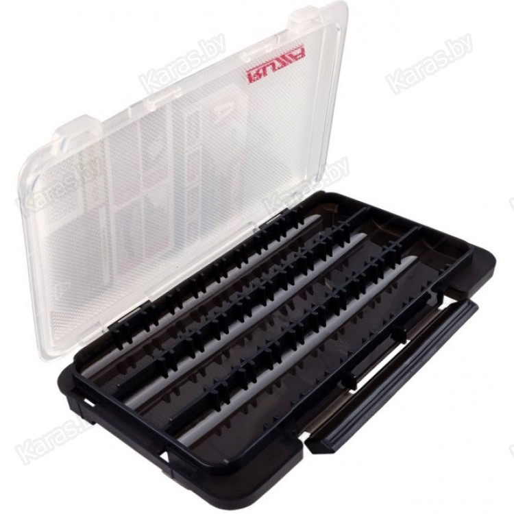 Односторонняя коробка для хранения приманок и аксессуаров из ударопрочного армированного пластика PP (полипропилен). Доступна регулировка свободного пространства посредством изменения расположения перемычек (12 шт). На внутренней стороне крышки нанесено рифление, препятствующее прилипанию мягких приманок. Коробка имеет возможность соединения с другими коробками серии посредством замков-защелок в нижней части.