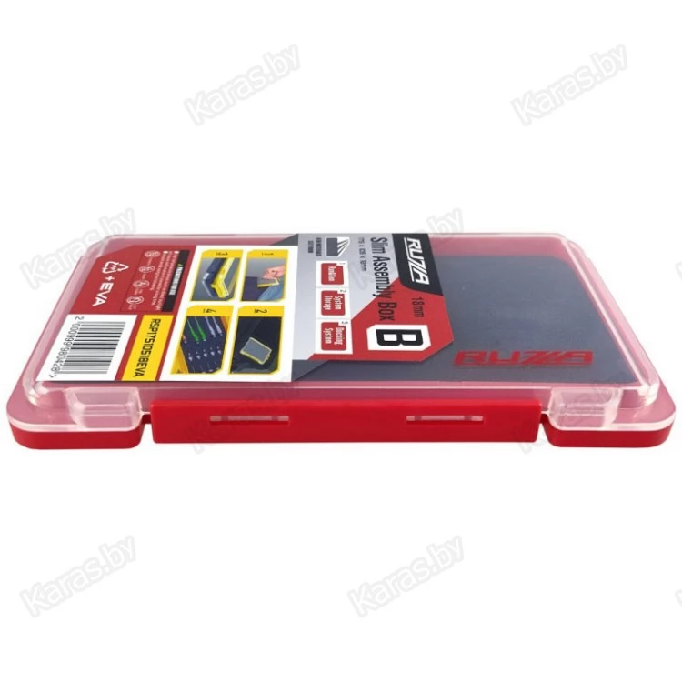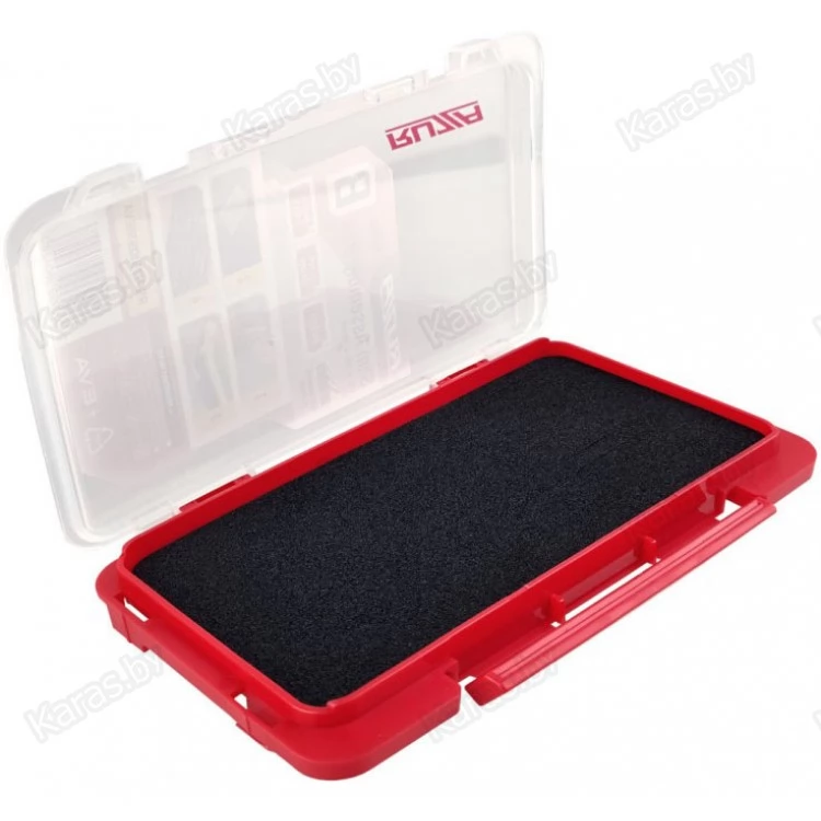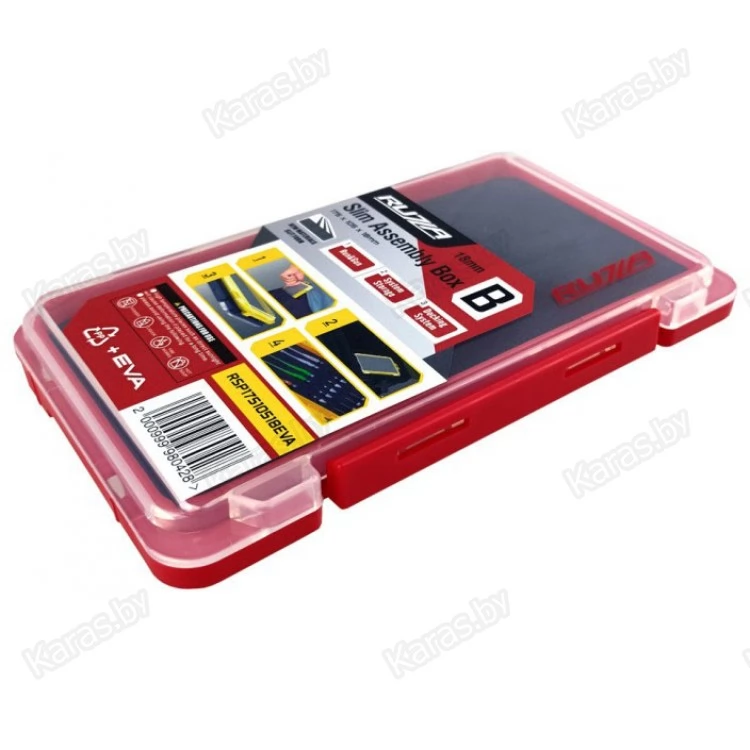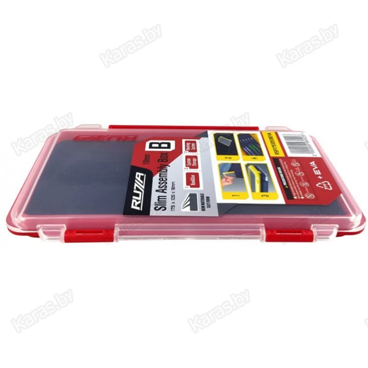 Односторонняя коробка из ударопрочного армированного пластика PP (полипропилен). Отсек снабжен плотной вспененной подложкой из EVA (этиленвинилацетат) с прорезями для надёжного хранения крючков и некрупных приманок. Коробка имеет возможность соединения с другими коробками серии посредством замков-защелок в нижней части.