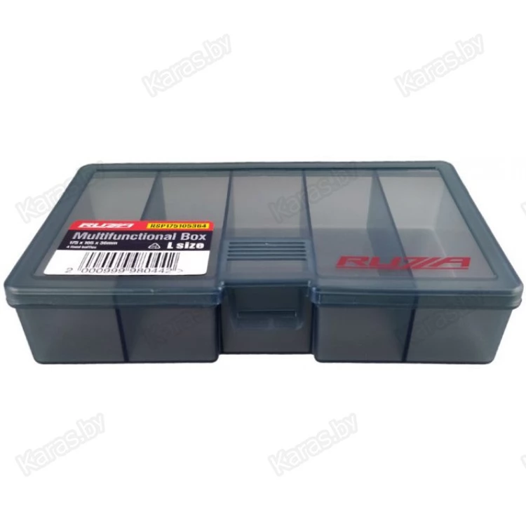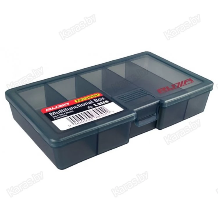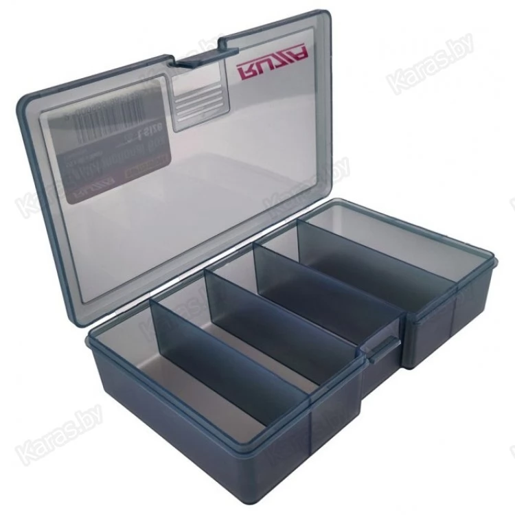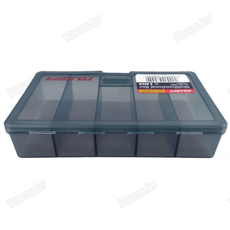Односторонняя коробка для хранения приманок и аксессуаров из ударопрочного армированного пластика PP (полипропилен). Коробка имеет четыре фиксированные перегородки, делящие ее на 5 самостоятельных отсеков.