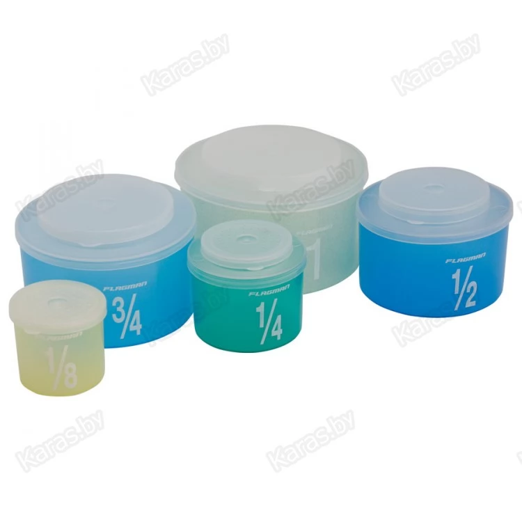 Набор коробок для наживки. Коробки вкладываются одна в другую, объем указан на стенке. Конструкция крышек не дает наживке покинуть коробку и при этом позволяет ее без труда извлекать. Коробки имеют перфорацию для свободного доступа воздуха. Сертифицированы FIPPS – только в такой таре живой компонент прикормки и наживку принимают для контроля на официальных соревнованиях.
