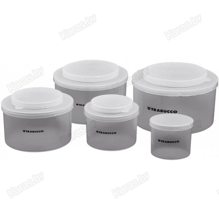 Набор емкостей Trabucco Official Bait Box Set с перфорированными крышками предназначен для хранения наживок. Комплект включает 5 коробок цилиндрической формы из полупрозрачного пластика. Размеры емкостей соотносятся друг с другом таким образом, что они могут вкладываться друг в друга по принципу матрешки. Благодаря перфорации крышек обеспечивается необходимая вентиляция внутри емкостей, которая необходима для хранения живых насадок. Полупрозрачный материал стенок коробок Trabucco Official Bait Box Set позволяет рыболову визуально контролировать объем содержимого емкости.
